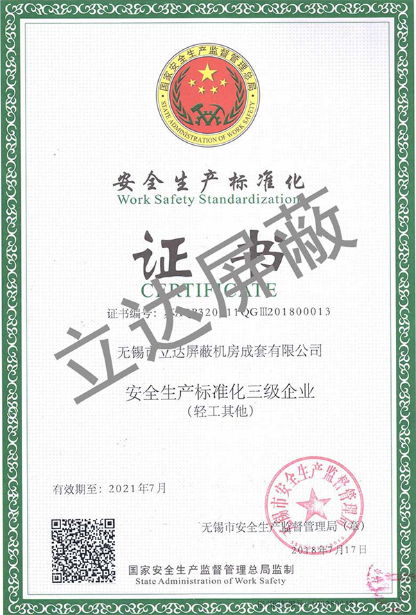 資質證書 專業的電磁屏蔽機房的研發、設計與制造商
