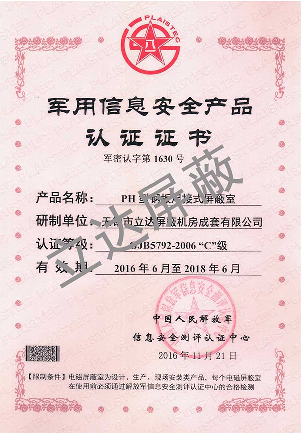 資質證書 專業的電磁屏蔽機房的研發、設計與制造商